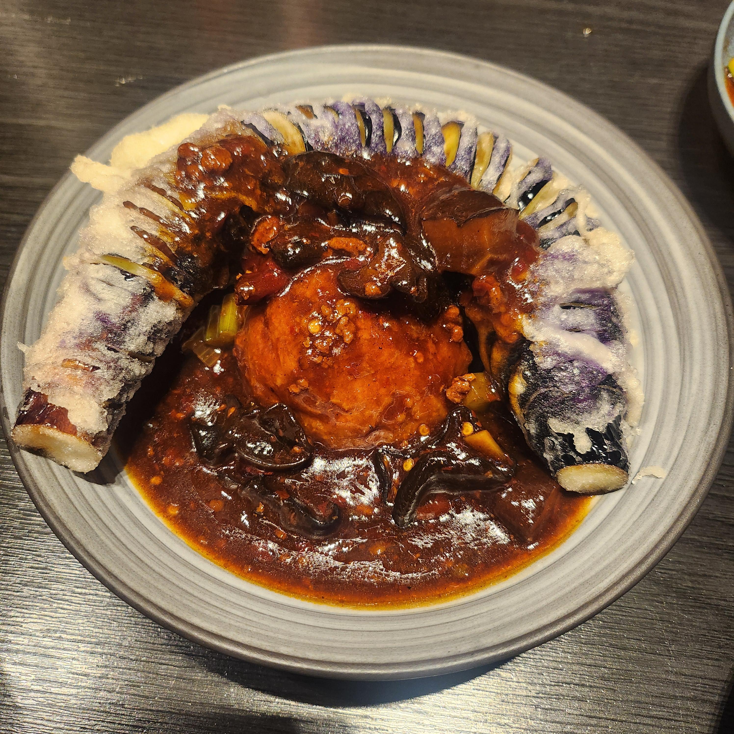 다섯 번째 요리, 어향완자가지예요. 제가 먹어본 어향가지는 가지를 통으로 튀기지 않고, 잘라서 튀긴 걸 먹어봤는데, 아코디언처럼 통으로 튀겨 눈호강이네요 ㅎㅎ 고기 완자와 가지를 소스에 찍어 먹으면 돼요. 소스는 마파두부할 때 넣는 두반장맛이 나더라고요. 식기 전에 얼른 먹어야 할 음식이에요. 식으니 느끼해져요. 여기부터 속이 느글느글 ㅎㅎㅎㅎㅎㅎㅎ