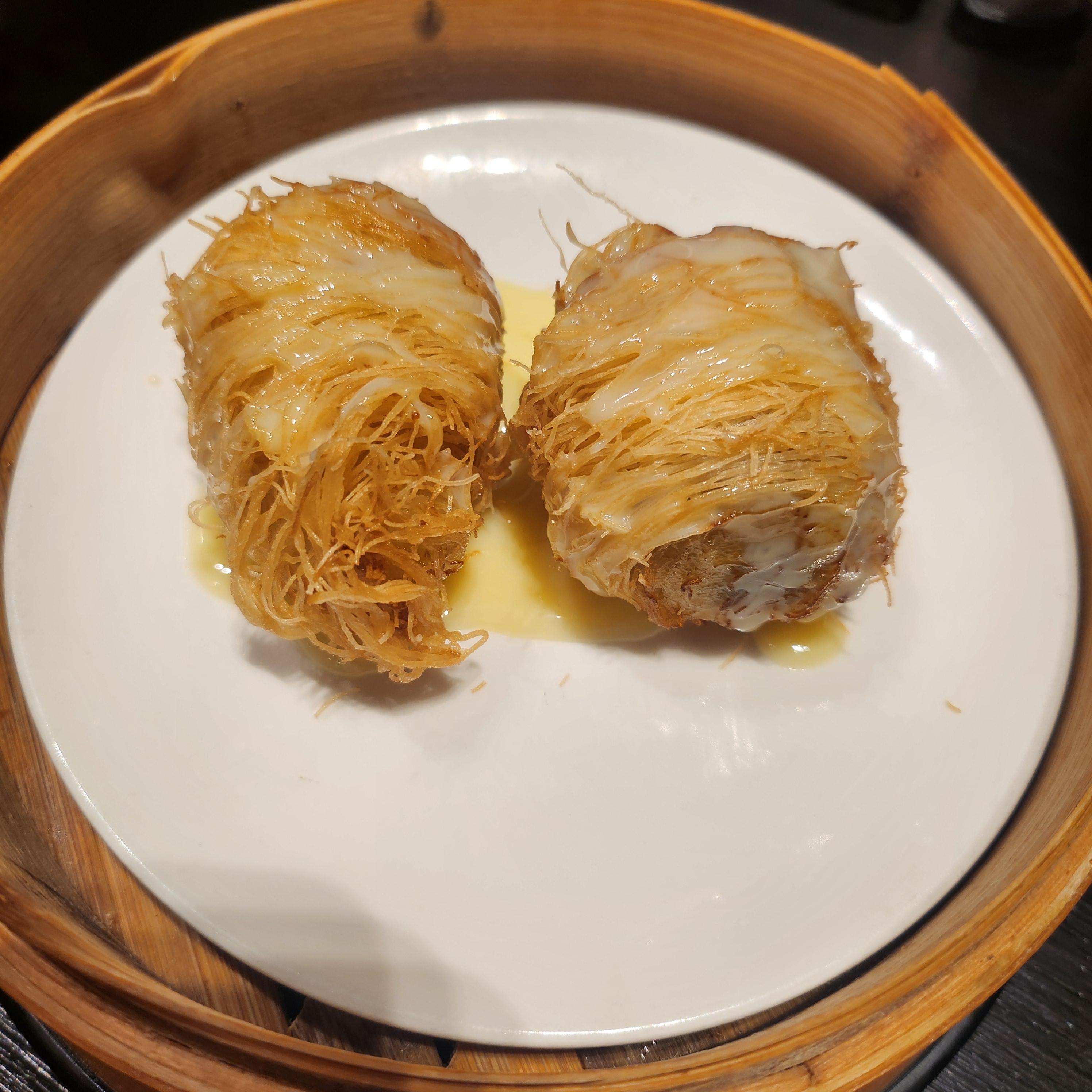 일곱 번째, 디저트 차가운 바나나를 카다이프면에 감싸서 튀긴 디저트예요. 연유가 듬뿍 뿌려져 있어요. 씹는 순간 바사삭 소리를 내면서 안에 부드러운 바나나 맛이 나더라고요.