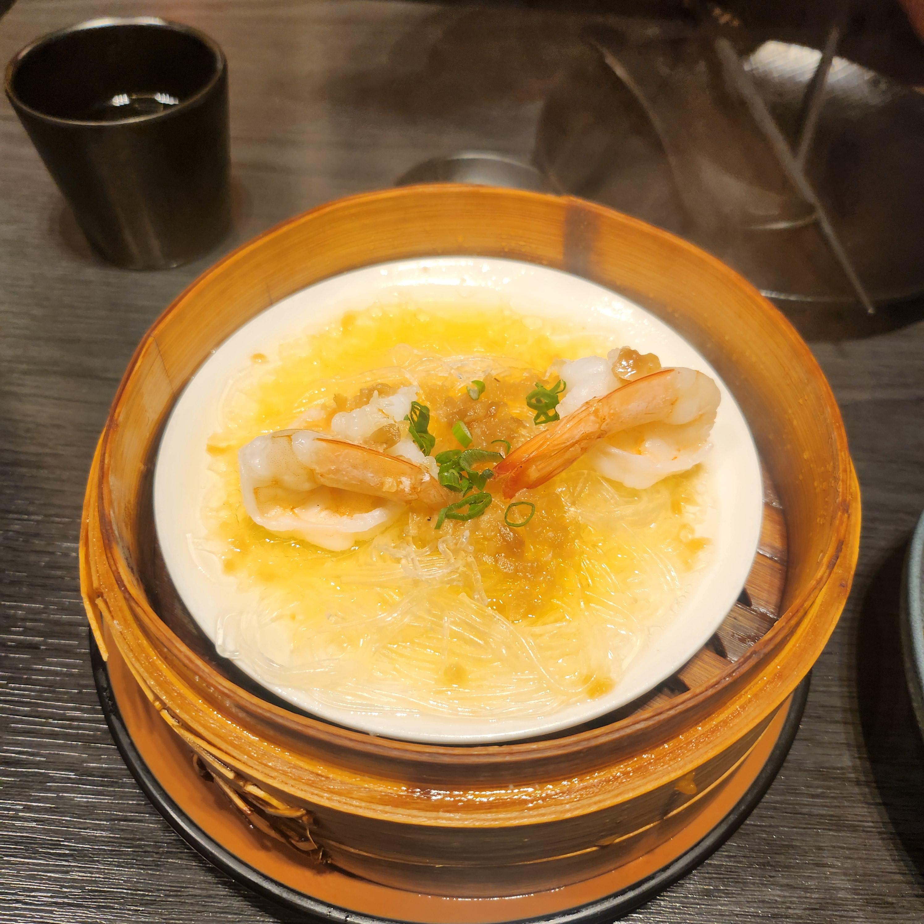 두 번째 요리, 마늘새우찜 탱글한 중하새우에 마늘당면찜? 저희가 흔하게 먹는 당면 식감은 아니고요. 누들컵라면, 하이디라오 나라펀 면 식감이에요. 새우와 면이랑 함께 호로록 먹으니 맛있었어요.